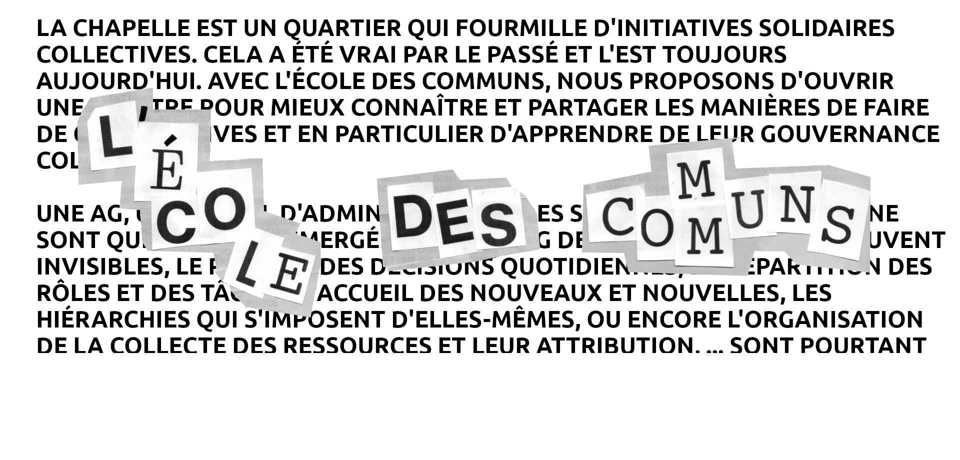 L’espace est émergé à partir du début comme un des thèmes centrales des communs à La Chapelle. En effet, a partir de la première visite et de la phase de conception de l’école des communs, on a discuté plusieurs fois des besoins du quartier et de ses organisations par rapport aux espaces et à leur équipement.