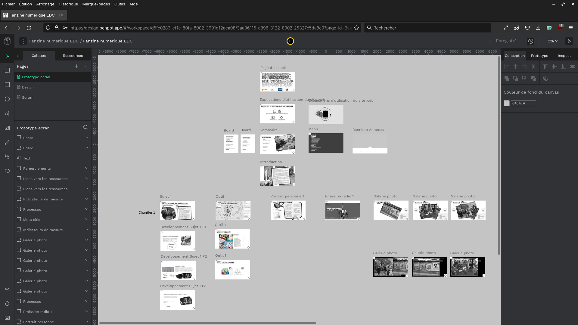 Il permet de rendre visible visuellement et de façon interactive le fanzine numérique avant sa réalisation finale en programmation. Il est réaliser dans le logiciel « PenPot » car c’est un logiciel libre et open source, gratuit. Il a pour but rendre visible l’interface du site web et la nature des interactions dans celui-ci. C’est un logiciel collaboratif qui permet concevoir les interfaces avec plusieurs personnes à la fois et de laisser des commentaires sur ce qui a été réaliser.
