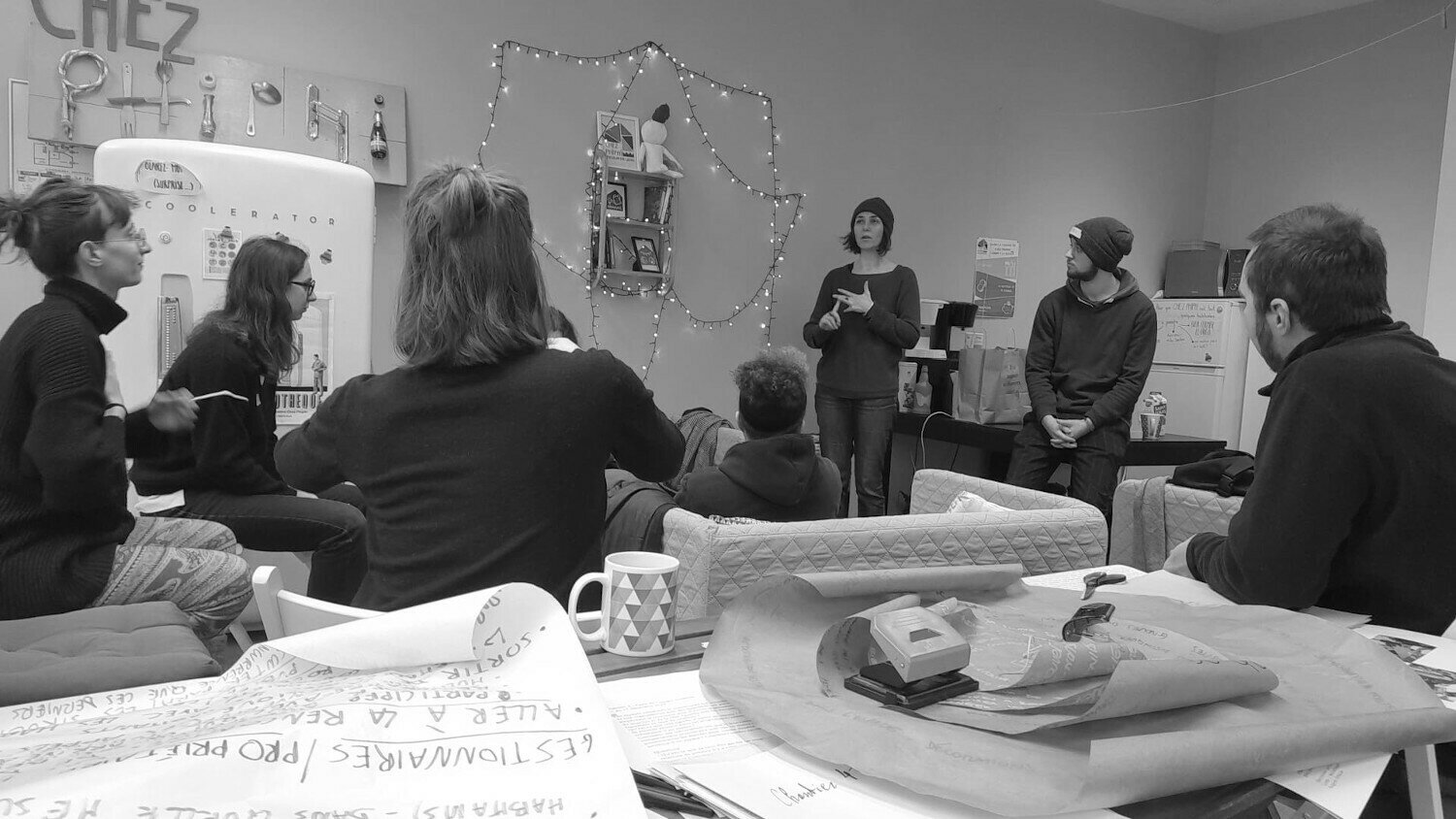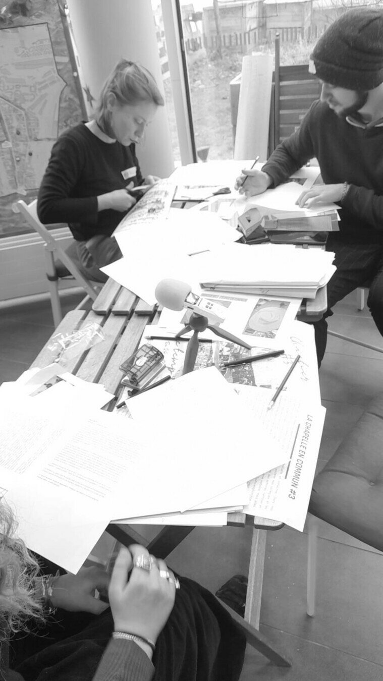 On a finalement partagé le dernier chantier en deux phases: premièrement, on a revu les chantiers précédents pour redessiner un parcours de questions ouvertes et outils de mise en commun. Deuxièmment on a partager le savoir-faire de la radio en produisant un bref podcast “Flash-info événements La Chapelle”.