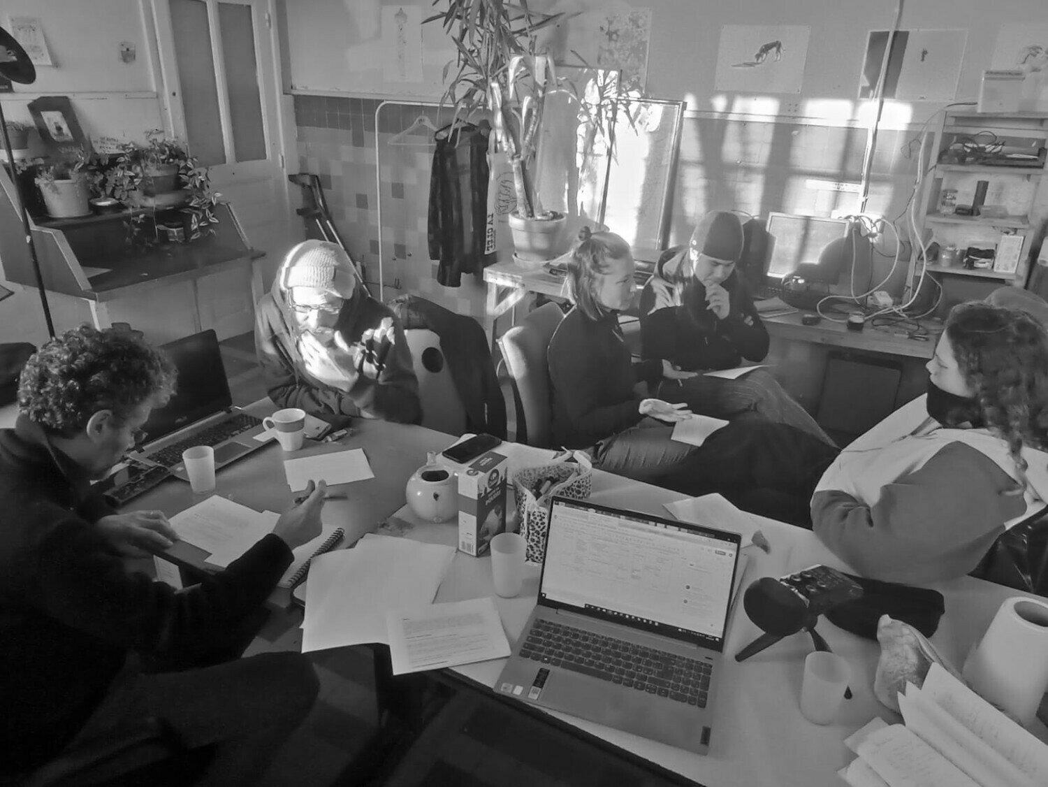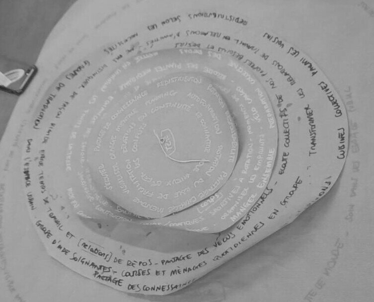 Le temps est une ressource qui a joué un rôle important dans la définition des objectifs de ce chantier, avec le choix de garder chaque atelier ouvert par tout le monde. En sachant que toute l’école à été traversée par des personnes différentes, à des moments différents, on aurait pas pu faire un recap compréhensible sans y dédier beaucoup de temps. On a donc privilégie le partage des compétences technique à fin de donner des outils, pendant que les contenus (issus des chantiers précédents) ont été donné par défaut comme contenu ( du site web et de la zine en particulier). Cela a marché particulièrement bien lors de la fabrication de la zine puisque parmi les personnes participantes on a eu au moins une personne présente à chaque chantier. On a donc proposé de travailler sur le chapitre de la zine correspondante, ce qui a permis de repenser aussi aux contenus à partir des discussions eu précédemment.