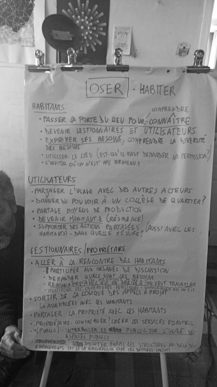 La question de l’ “oser” a été explorée en choisissant trois points de vue sur la relation avec l’espace: habitant, utilisateur, propriétaire/gestionnaire. L’idée était d’explorer les différents intérêts des différentes personnes par rapport à la ressource spatiale, pour essayer de réfléchir à des outils théoriques et pratiques qui permettent de faire croiser et équilibrer ces intérêts, ce qui est au centre de l’idée de l’espace comme bien commun. Pour simplicité, on a considéré très marginalement les relations entre propriétaire et gestionnaire, qui semblaient moins relevantes pour le public choisi.