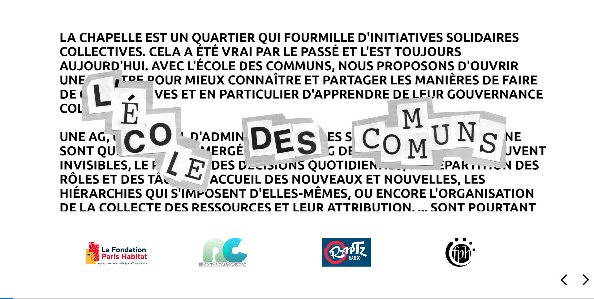 Le chantier « Se rejoindre, se raconter ! » était un temps de partage et de co-construction d'une promenade dans le quartier La Chapelle. Il avait pour but de faire connaître les initiatives qui racontent chacune à sa manière le quartier, comment elles ont été conçues et réalisées, et comment elles sont utilisées (ou pas), c’était une entrée sur les pratiques de mobilisation et d'engagement. Le chantier permet de se familiariser avec des outils de cartographie des ressources du quartier. C'était aussi une opportunité pour échanger sur ce que nous voudrions partager entre collectifs, groupes et habitants et comment le faire. La promenade a été conçue et réalisée ensemble comme une ressource mise en commun. Enfin, le chantier ouvrirait une discussion sur les prochains chantiers que nous voudrions organiser ensemble pour faire école des communs à La Chapelle.