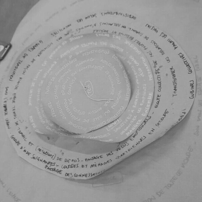 De fait de sa dimension, le quartier représente une échelle privilégiée pour créer des environnements de vie durables et permettre des pratiques mutualistes. Ce chantier a donc été l’occasion de réfléchir et de questionner le quartier comme un espace de mise en commun et de définir les types d’infrastructures nécessaires pour y parvenir. En prenant en compte les apprentissages des 4 chantiers précédents, et en s’inspirant des pratiques existantes de collaboration de voisinage en France et dans le monde, nous avons partagé des outils tels que la radio, les fanzines et un espace numérique, pour un voisinage qui encourage les nouvelles connexions et peut générer des structures de proximité de soins et de soutien collectifs.